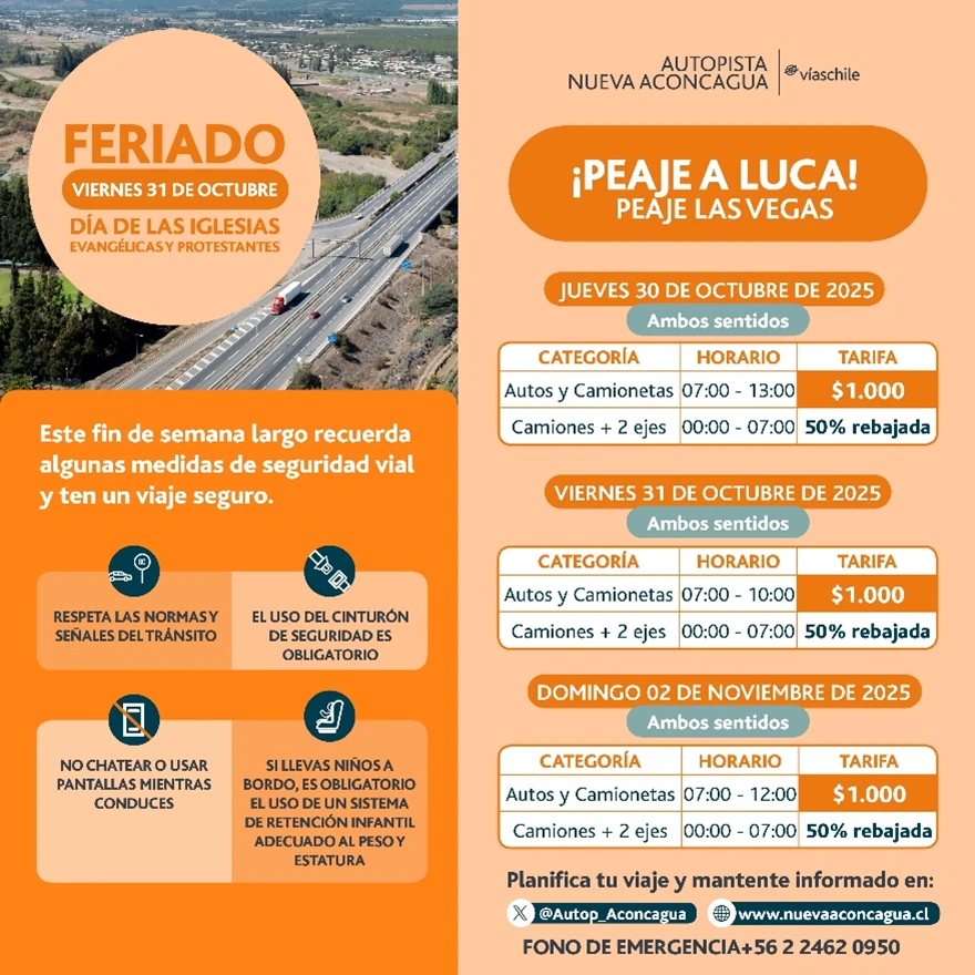 Santiago, octubre de 2025. – VíasChile, con su sociedad concesionaria Autopista Nueva Aconcagua (Ruta 5, Tramo Santiago-Los Vilos), anunció la implementación de un plan de contingencia por el feriado largo que se producirá en el contexto del Día Nacional de las Iglesias Evangélicas y Protestantes. Esto, considera la rebaja tarifaria decretada por el Ministerio de Obras Públicas en determinados horarios del jueves 30 y viernes 31 de octubre, así como el domingo 02 de noviembre. Además, se dispondrá el total de los recursos de apoyo con los que cuenta la autopista y se utilizarán medidas de precaución para promover un viaje más seguro entre quienes se trasladen por la ruta.